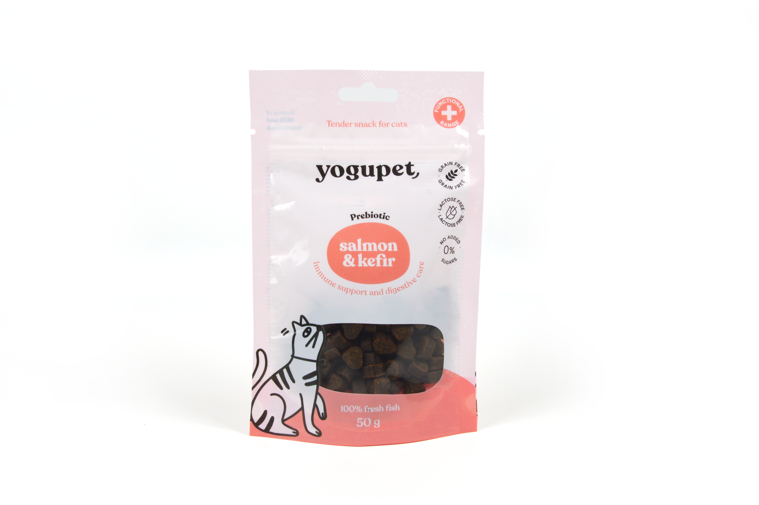 Полувлажни хапки за котки с прясно пуешко, синя риба, 5% прясна сьомга и кефир без лактоза. Меки, ароматни и лесносмилаеми – идеални за награди или като topper върху храната.